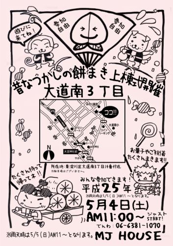 | 5/4(土)AM11:00〜東淀川区大道南3丁目の現場にてmomotarou恒例となった 『昔なつかし餅まき上棟式』を開催します!! (※雨天時の場合は5/5(日)AM11:00〜となります。) 誰でも参加できます! お菓子やご祝儀、たくさんまきます! 今回は、紅白餅もまきます! お時間は11時ジャストスタート! 開催場所は 大阪府大阪市東淀川区大道南3丁目14番付近 詳しくは下記URLよりご覧下さい。 http://www.mj-house.cc/event/05-04.html |